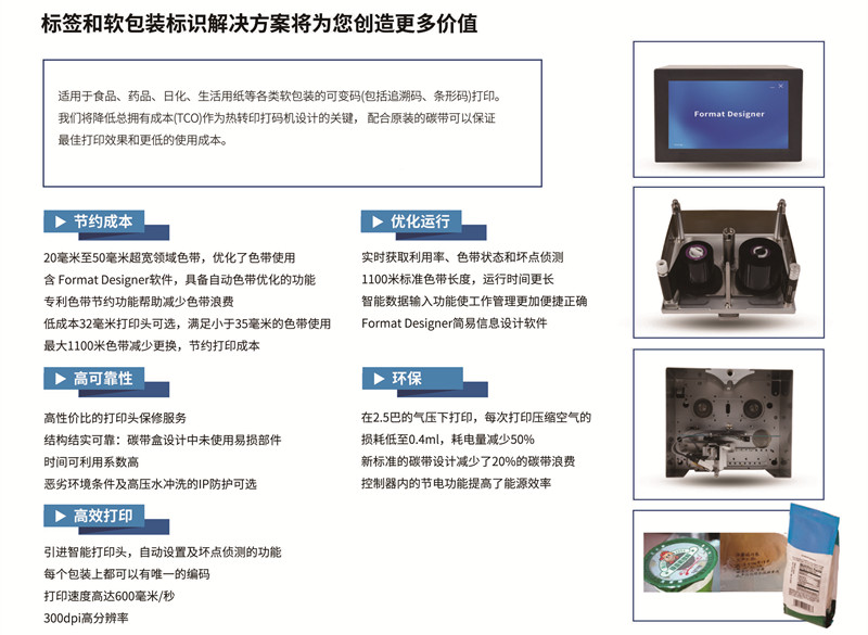 產(chǎn)品簡(jiǎn)介:適用于食品、藥品、日化、生活用紙等各類軟包裝的可變碼(包括追溯碼、條形碼)打印。我們將降低總擁有成本(TCO)作為熱轉(zhuǎn)印打碼機(jī)設(shè)計(jì)的關(guān)鍵,配合原裝的碳帶可以保證最佳打印效果和更低的使用成本。
